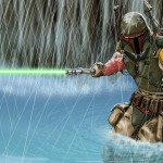 boba fett with light saber in the rain -